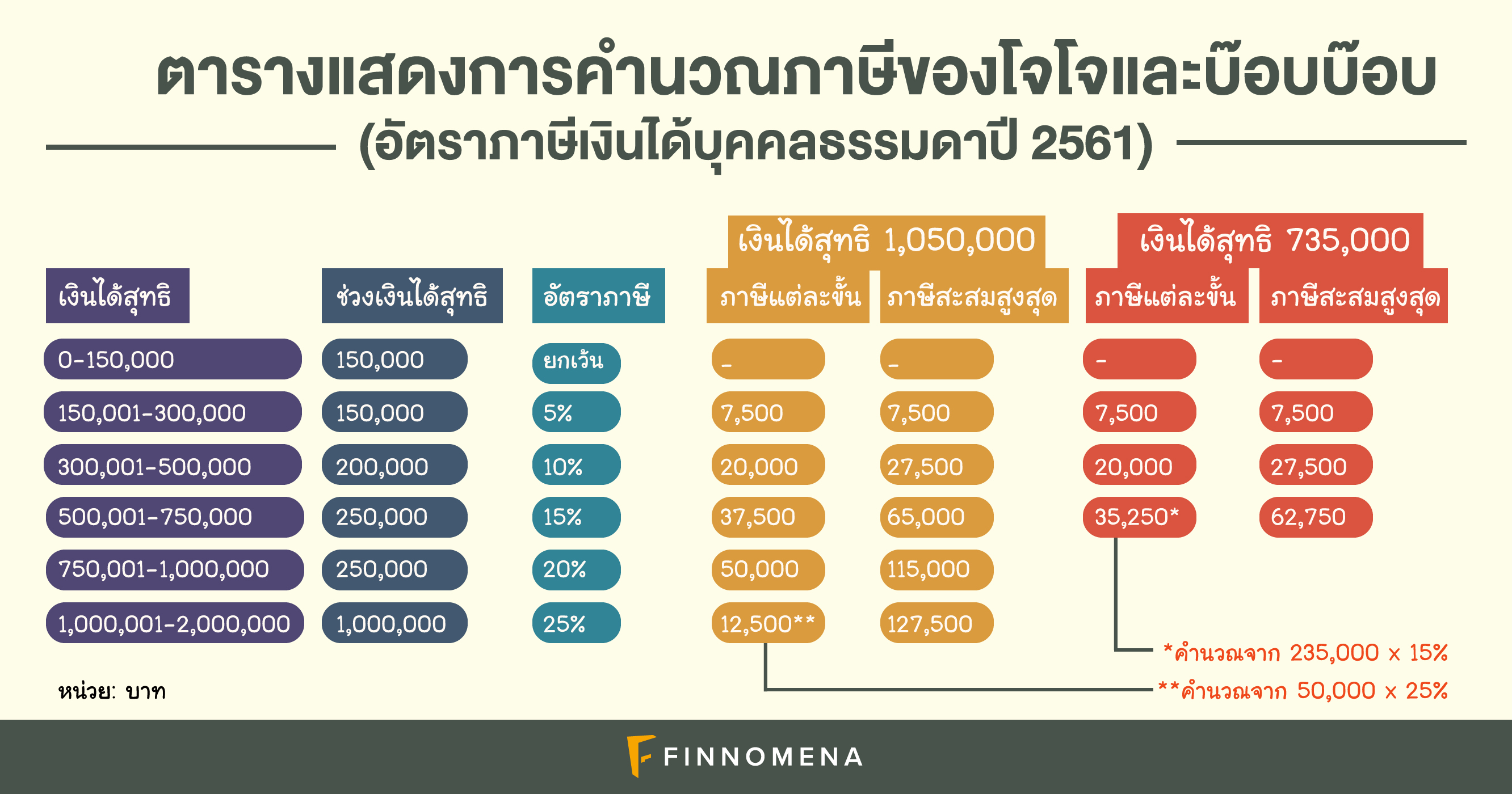 ในขณะที่บ๊อบบ๊อบ ที่ยังคงยืนกรานและถือคติที่ว่าไม่ลดหย่อนภาษีแล้วเอาเงินไปใช้ หรือไปเอาไปทำอย่างอื่นดีกว่า ทำให้ต้องจ่ายภาษีทั้งหมด 127,500 บาท หรือคิดเป็น 12.14% ของรายได้