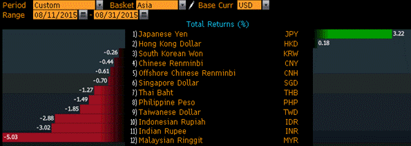 รูปที่ 1 แสดงค่าเงินในเอเชียหลังจากจีนลดค่าเงินหยวนลง (ช่วงวันที่ 11 ถึง 31 ส.ค.) สาเหตุที่เยนแข็งค่าเป็นเพราะการ Unwind Carry trade ระหว่าง Nikkei225 กับ JPY นะครับ (ที่ผ่านมา Nikkei ขึ้น พร้อมๆกับการอ่อนค่าของ JPY เมื่อตลาด Nikkei ไหลลงตามตลาดหุ้นทั่วโลก JPY จึงกลับแข็งค่าขึ้น)