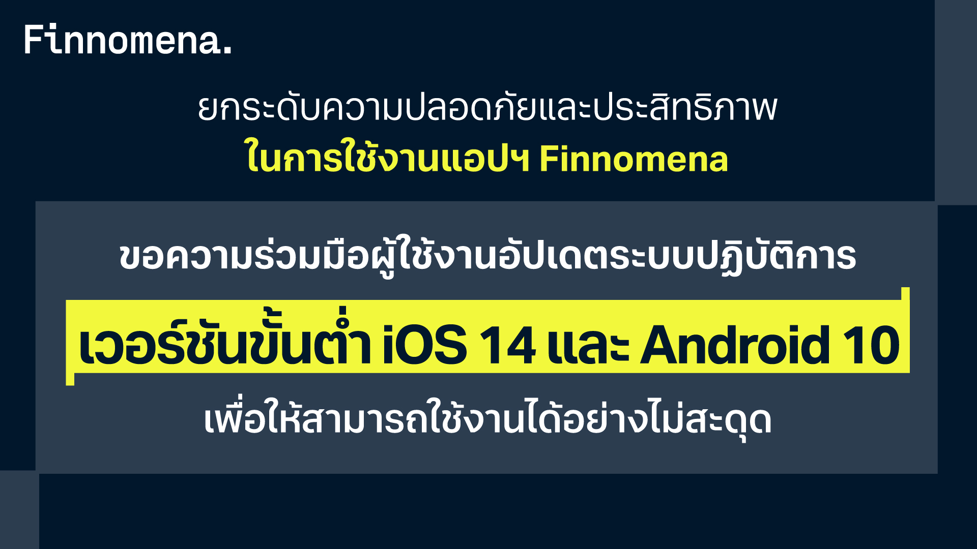 เพื่อยกระดับความปลอดภัยในการทำธุรกรรม และมอบประสบการณ์การใช้งานที่ดีที่สุด Finnomena ขอแจ้งให้ทราบว่า ตั้งแต่วันที่ 1 กุมภาพันธ์ 2569 เป็นต้นไป แอปพลิเคชัน Finnomena จะรองรับเฉพาะระบบปฏิบัติการ