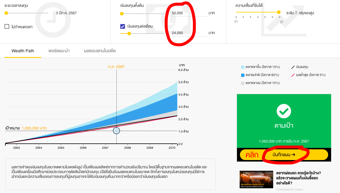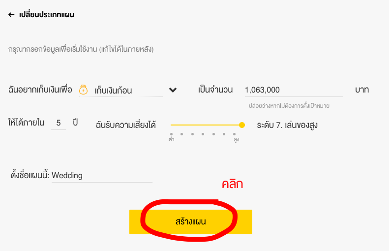 3. กรอกรายละเอียดต่างๆ เช่น จุดประสงค์การเก็บเงิน (ในที่นี้เรากรอก “เก็บเงินก้อน”), จำนวนเงินเป้าหมายที่อยากได้ (ในที่นี้เรากรอก 1,063,000 บาท), ความเสี่ยงที่รับได้ (ในที่นี้เราเลื่อนไปที่ “สูงสุด”) เป็นต้น เสร็จแล้วก็กด “สร้างแผน”