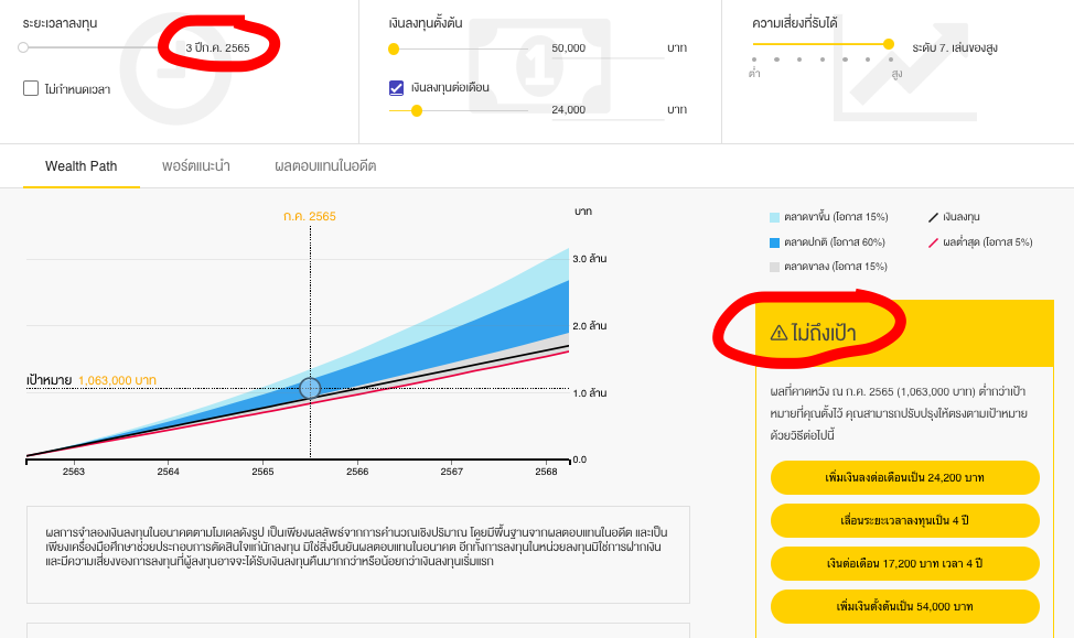 นั่นไง! ไม่ถึงเป้า แสดงว่าระยะเวลาสั้นเกินไป สำหรับเงินลงทุนเท่านี้ ถ้าเราอยากเก็บให้ทัน 3 ปีจริงๆ ก็ต้องลงทุนมากขึ้น ซึ่งในกล่อง “ไม่ถึงเป้า” ก็จะมีตัวเลือกให้เราพิจารณาว่าจะไปทางไหนแทน