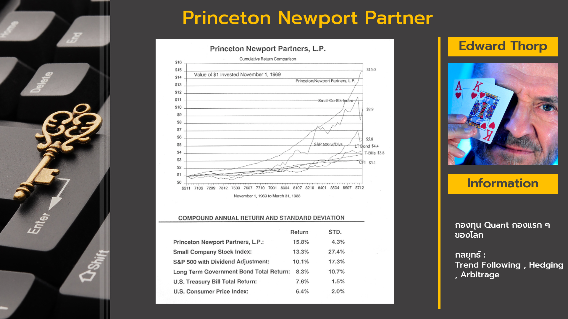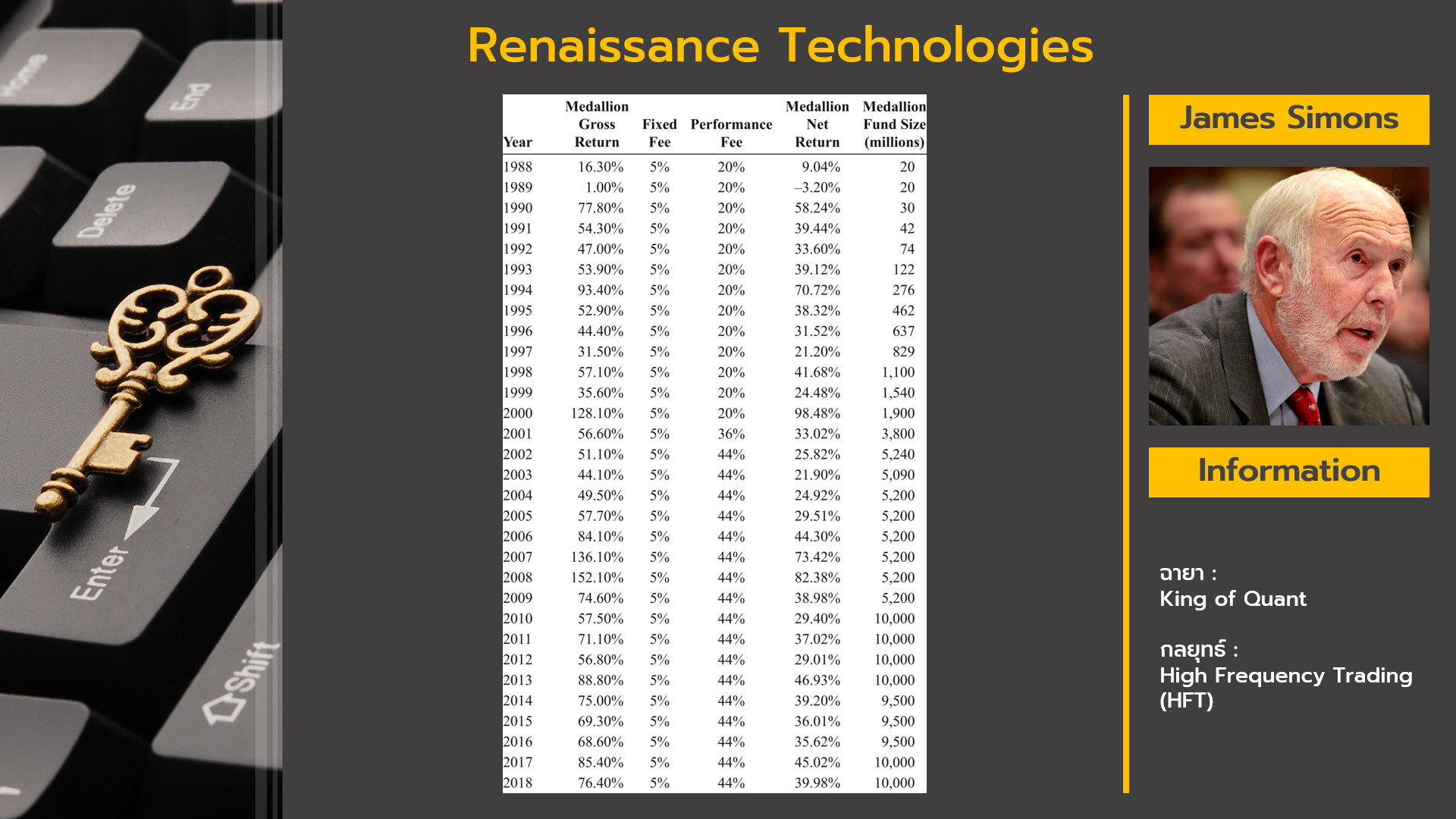 เนื่องจากการใช้ Quant ในการลงทุนมีมาอย่างยาวนาน ไม่ว่าจะนักลงทุนบุคคลหรือสถาบัน เราจึงขอยกตัวอย่างกองทุนที่ใช้ Quant จนสามารถสร้างผลลัพธ์ได้อย่างโดดเด่นอย่างยาวนาน ดังนี้ครับ