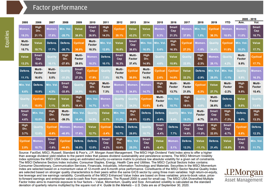 ภาพด้านบนคือผลตอบแทนของสินทรัพย์ขนาดใหญ่ ๆ ทั่วโลก เช่น ตลาดหุ้นประเทศพัฒนา, ตลาดหุ้นกำลังพัฒนา, อสังหา, Fixed Income, High Yield Bond เป็นต้น ว่าแต่ทำไมไม่รวมสินทรัพย์ดิจิทัลเข้าไปด้วยนะเนี่ย งอนได้มั้ย…ตั้งแต่ปี 2005 จนถึงปัจจุบันเราจะเห็นว่าสินทรัพย์แต่ละชนิดมี % การเปลี่ยนแปลงที่แตกต่างกัน ถามจริงๆว่าเราจะเชื่อมั่น 100 % ได้ยังไงว่าสินทรัพย์ไหนจะมาในปีถัดไป หรือสินทรัพย์อื่นๆ จะไม่แซงหน้าได้กำไรดีกว่าสิ่งที่เราเลือก เพราะจากตารางนี้ดูผ่านๆ ก็เหมือน Random พอสมควร ฉะนั้นเราจึงต้องมีการ Selection สินทรัพย์ของเราให้ดีก่อนซึ่งเทคนิคการ Selection นั้นทุกคนน่าจะพอหาข้อมูลได้ไม่ยากแต่ในวันนี้เราอยากจะนำเสนออีกมุมมองในการคัดเลือกสินทรัพย์ลงทุนที่เรียกว่า Factor Rotation ซึ่ง Factor ที่ต่างประเทศนำมาใช้มีเยอะแยะมากมายตามรูปประกอบด้านล่างพร้อม Factor Performance ในแต่ละปี