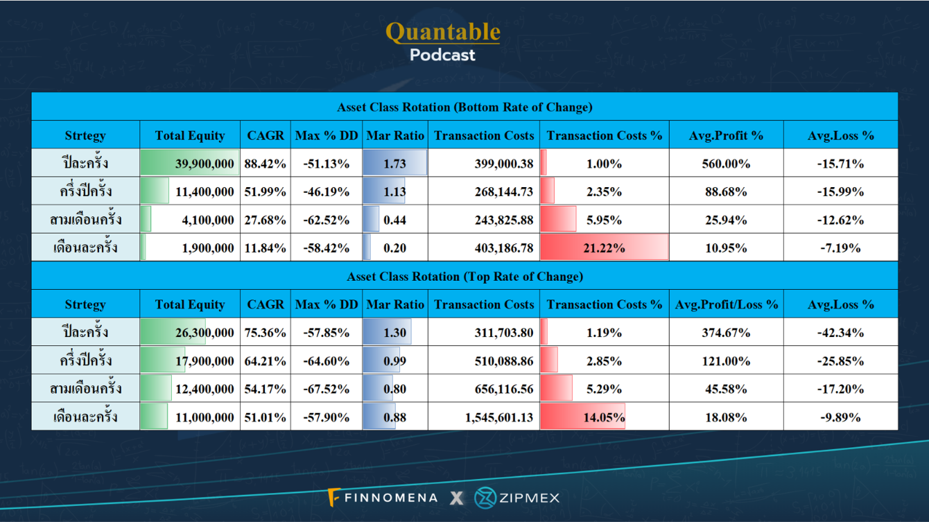 - ยิ่ง Rotation บ่อยจะเกิดต้นทุนในการทำธุรกรรมที่มากเกินไป ยกตัวอย่างการเปลี่ยนสินทรัพย์เดือนละครั้งจะมีต้นทุนถึง 21.22 % และ 14.05 % ถ้าเทียบกับพอร์ตการลงทุนของคุณเอง